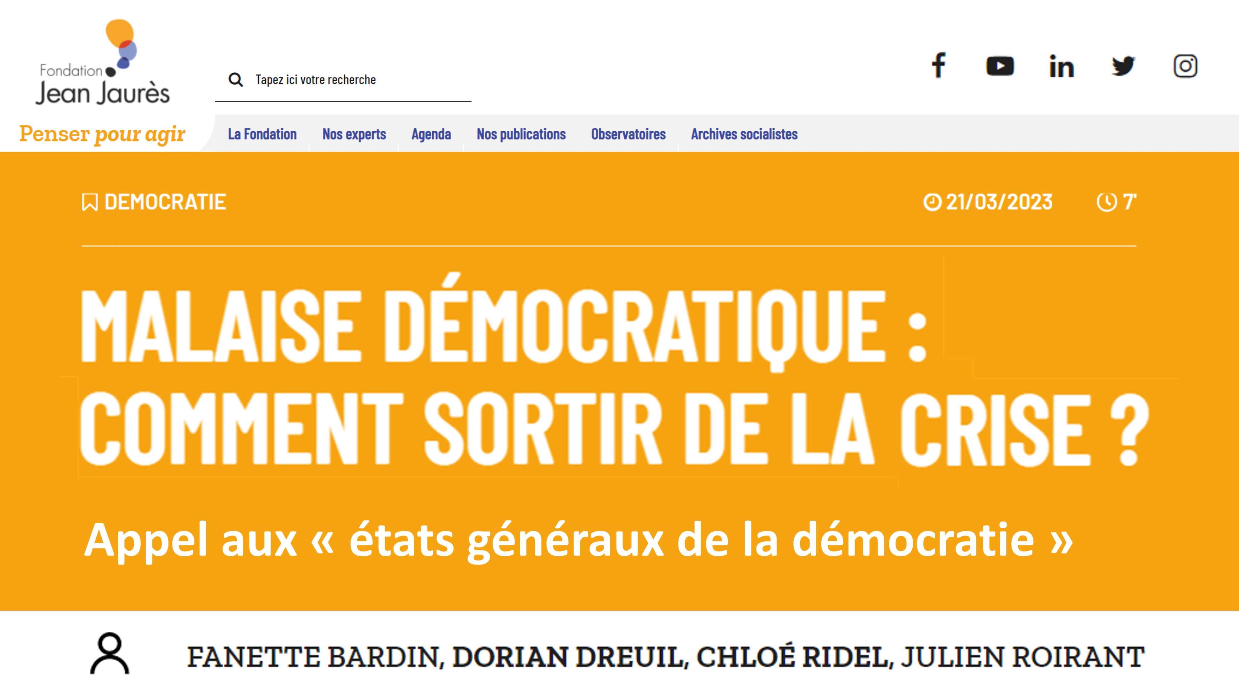 Note de la fondation Jean Jaurès appelant à des #EtatsGénérauxDémocratie prolongés par une #ConventionCitoyenne de la démocratie puis un #PréférendumConstituant.